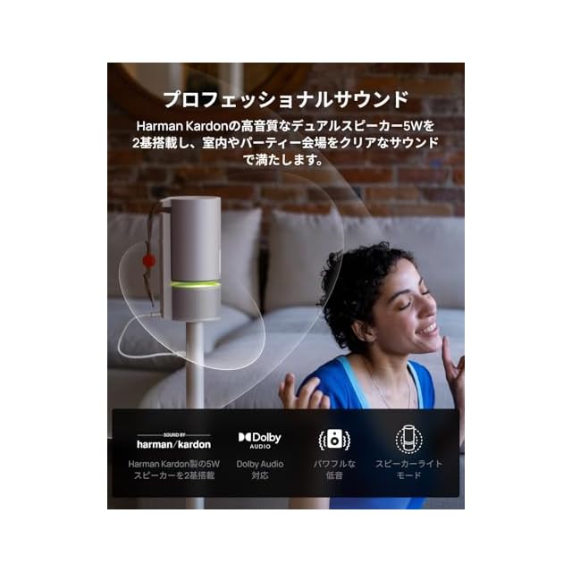 音楽が語りかける:Harman Kardonの高音質な5Wスピーカーを2基搭載し、室内やパーティー会場をクリアなサウンドで満たします。スピーカーとして使用するだけでなく、スピーカーライトモードと組み合わせれば、どんなシーンにも楽しい演出を加えることができます。