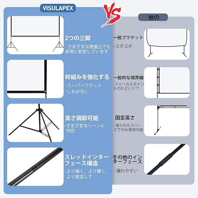 堅牢な安定性: VISULAPEX ダブル三脚プロジェクター スクリーンの頑丈な構造で安心感を体験してください。 当社のスクリーンは、三角形の安定性とさまざまな地面に耐える安全な基盤を備えています。 劣悪なコネクタを備えたスクリーンとは異なり、当社のネジ接続は安定性が向上し、取り付け手順が少なくて済むため、時間と費用を節約できます。