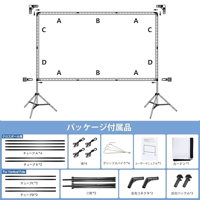簡単な取り付けと携帯性:工具を必要とせず、数分でプロジェクタースクリーンを簡単にセットアップできます。 4つのフレームをポールに簡単に組み立てて接続します。 重量はわずか 3.7 kg で、屋外用キャリーバッグが付属しています。 当社のポータブル スクリーンは持ち運びや保管が簡単で、外出先でのエンターテイメントに最適です。