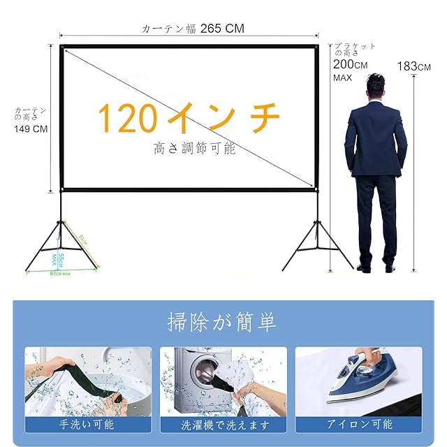 洗える大型スクリーン: 洗える 100 インチのポリエステル生地スクリーンで、鮮明で鮮やかなビジュアルをお楽しみください。 高密度で厚みのある素材により、16:9のアスペクト比と160°の広い視野角で鮮明で明るい投影がされ、庭、寝室、ホームシアター、教室、会議室、キャンプなどで多用途に使用できます。