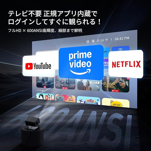 【公式アプリ搭載ですぐに視聴可能】MX1家庭用プロジェクターは、Netflix、Prime Video、YouTubeなどの公式認証アプリを内蔵しているため、面倒な設定なしで、電源を入れるだけですぐに大画面でコンテンツを楽しめます。さらに、Disney+、Huluといった人気のストリーミングサービスも手軽にダウンロード可能。外部デバイスを接続する手間なく、映画やアニメをすぐに視聴できるのが魅力です。アカウントログインや日本語字幕の切り替えにも対応しており、操作画面は非常にシンプルでスムーズ。サードパーティ製OSにありがちな強制終了やアップデート不可といった心配がなく、安定した快適な視聴体験を長く提供します。また、「テレビ番組も見たい」という方には、地上波チューナー内蔵のテレビボックス(別売)をHDMI端子に接続するだけで、通常のテレビ視聴も可能です。システムの定期アップデートにも対応しているため、常に最新の状態で安心してお使いいただけます。