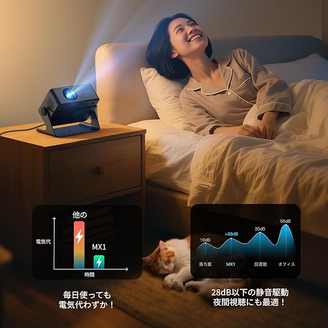 【360度回転で天井にも自由に投影】従来のプロジェクターが三脚スタンドを必要とするデザインを刷新し、MX1は洗練された一体型スタンドを搭載しました。これにより、角度調整が自由自在。従来の正面投影だけでなく、下向きや上向きへの投影も可能になり、寝転がったまま大画面を楽しむ「天井投影」も手軽に実現します。広い視野角であらゆる角度からの投影に対応し、ソファや寝室、車中泊など、様々なシーンで好きな体勢で快適に映像を満喫できます。スペースを取らない設計は、一人暮らしやワンルームに最適な家庭用小型プロジェクターです。