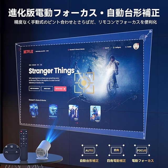 ✨【自動台形補正・便利な電動フォーカス】当プロジェクターは、自動台形補正と電動フォーカス機能を搭載。従来の手動調整に比べ、設置時間を大幅に短縮し、誰でも簡単に最適な投影状態を実現できます。面倒な設定は一切不要! ワンタッチでキレイな矩形&ピント調整。プロジェクターを机の端に置いたり、天井吊りに設置したりしても、センサーが傾きを検知し、数秒で歪みを補正します、ピント合わせが微調整が必要な場合は、リモコンから簡単に修正可能。面倒な初期設定が一切不要です。(垂直補正のみ)