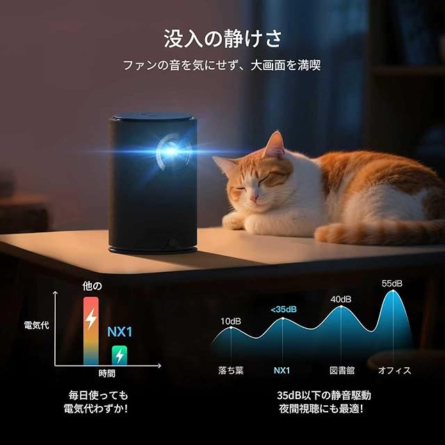 【静寂と臨場感:映像への没入感を高める超静音設計と高音質サウンド】プロジェクターの気になる「騒音」は、NX1PROなら心配いりません。図書館並みの35dB以下という三重静音設計を実現し、映像への没入感を一切損ないません。また、高音質スピーカーと双方向Bluetooth 5.4機能を搭載。お好みの外部スピーカーやヘッドホンへ接続できるのはもちろん、プロジェクター自体をBluetoothスピーカーとして利用することも可能です。朝の音楽鑑賞から夜の映画鑑賞**まで、シーンに合わせた活用で、あなたの日常をより豊かに彩ります。