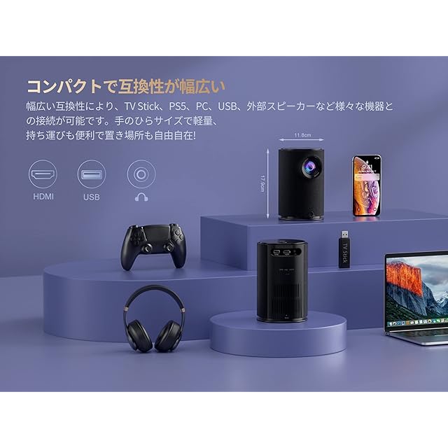 【どこでも大画面:超小型・軽量設計で広がる多様な利用シーン】2025年最新モデルNX1PROは、直径12cm×高さ18cmというコンパクトサイズ。コーラ缶より約1/3大きいだけのプロジェクター小型ボディと、わずか0.8kgの軽量設計が特長です。リビングの棚、寝室のサイドテーブル、一人暮らしのデスクなど、どんな狭い空間にもすっきり収まり、インテリアとしても映えるおしゃれなプロジェクターです。収納バッグやバックパックに入れて手軽に持ち運び可能なので、友人宅でのゲームパーティー、家族でのキャンプやアウトドア、テラスでの映画鑑賞など、「どこでも映画館」という新しいエンターテイメント体験をNX1PROが提供します。