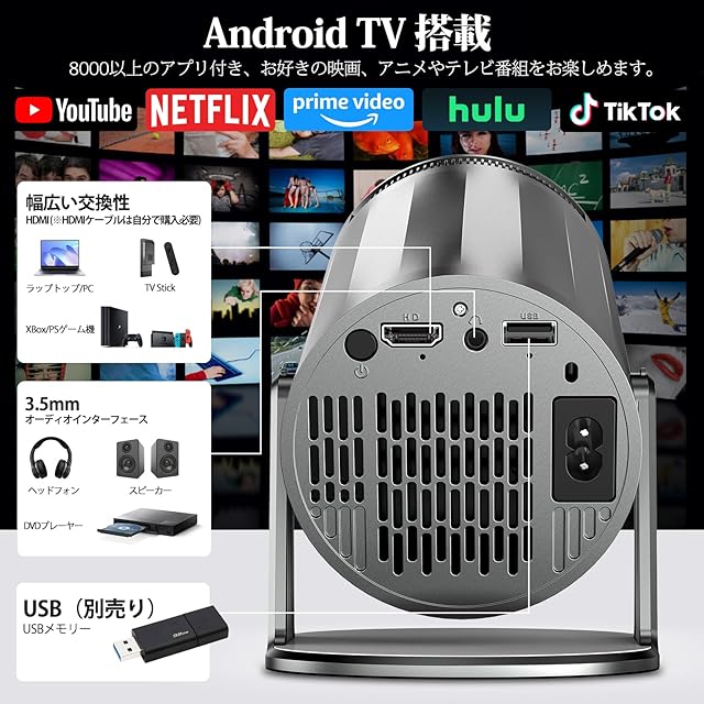 【幅広い互換性&80000Hの超長い寿命】Wi-FiとBluetooth接続に加えて、ミニプロジェクターはHDMI、USB、3.5mmオーディオポートも装備しており、PC、DVDプレーヤー、タブレット、USBストレージ、PSゲーム機、スピーカー、ヘッドフォンなどと互換性があります。 また、独自開発の循環冷却システムにより80,000時間以上の超長寿命を実現しており、安心してご使用いただけます。(パッケージ内容:プロジェクター本体、リモコン(単4形乾電池×2本 ※別売り)、電源コード、日本語説明書)