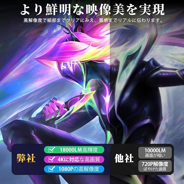 【2024年新登場! 実用性が高い】他店のプロジェクターと比べ、弊店の小型プロジェクターは18000ルーメンで高輝度、270°回転可能、4Kに対応で高画質と高解像度、Android TV搭載、低遅延Wi-Fi 6、Bluetooth5.4搭載で超高速転送、高音質HIFIスピーカーや自動台形補正など優れた機能をたくさん持っています。更に日本語、英語、中国語、スペイン語など51種類の言語をサポートしており、どこの国の人でも簡単に操作できます。そして、日本語説明書もあり、初心者でも困りません。