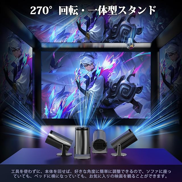 【270°回転&自動台形補正&電動フォーカス】据え置く型プロジェクターと異なり、このプロジェクターは270°回転できる一体型スタンドが装備されているため、三脚を使用する必要がなく、スタンドを回転するだけで、自由に投影角度を選択して、壁や天井などに投影でき、座ったり、寝転んだり、横向きになったりしながら、リラックスした映画鑑賞体験を実現できます。また、この天井プロジェクターは自動的に上下を調整する自動台形補正機能を搭載しており、4面補正と合わせて、リモコンでどの角度から見ても最適な投写映像に調整します。あなたのスタイルで、映像体験をお楽しみください!(ご注意:リモコンを本体の後ろに向いて操作してください。一部のアプリケーション画面ではリモコンのカーソルを切り替える必要があります。)