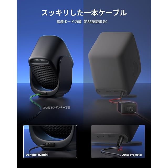 【190°投影角度調整&ゼロクラッターデザイン】N2 miniミニプロジェクターは内蔵ジンバルスタンドを搭載し、190°の広範囲チルト調整が可能。床から天井まで、自在に投影できます。統合電源ボードにより大型アダプターが不要になり、シンプルな1本の電源ケーブル接続ですっきりとしたセットアップを実現。さらに、スタンド台に配置された電源ポートにより、ケーブルの干渉なくスムーズなチルト調整が可能です。