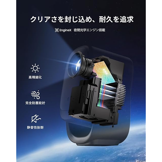 【密閉光学エンジン・長期クリア画質】「EngineX密閉光学エンジン」を採用し、塵の侵入を防ぐことで長期にわたるクリアな画質を維持。27dB以下の静音設計で、映画鑑賞やプレゼンテーションに集中できる環境を実現。鮮明で高精細な映像を、いつでも安定してご提供します。