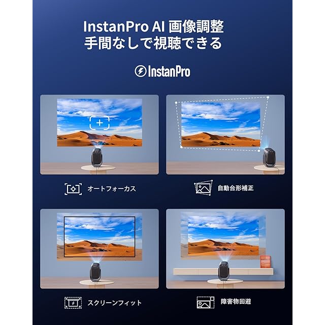 【AI自動調整・設置に手間いらず】InstanPro AI画像調整機能を搭載し、オートフォーカス、自動台形補正、スクリーンフィット、障害物回避が備えております。壁や天井、床など、どんな投影面でも最適な画質を自動調整するため、面倒なマニュアル設定は不要。常にクリアで歪みのない映像を提供します。