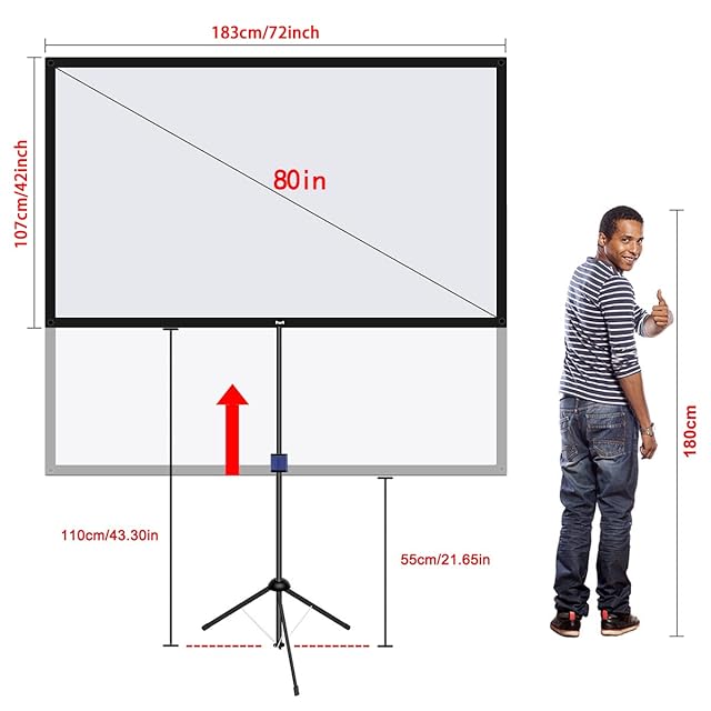 改良新版 4K対応 プロジェクタースクリーン 自立式 携帯型 三脚式 サポート壁掛け 屋内屋外兼用 最大80インチ(スクリーン107X 183cm) 16:9 視野角160° 防しわ加工 お手入れ簡単 (ガラス繊維)