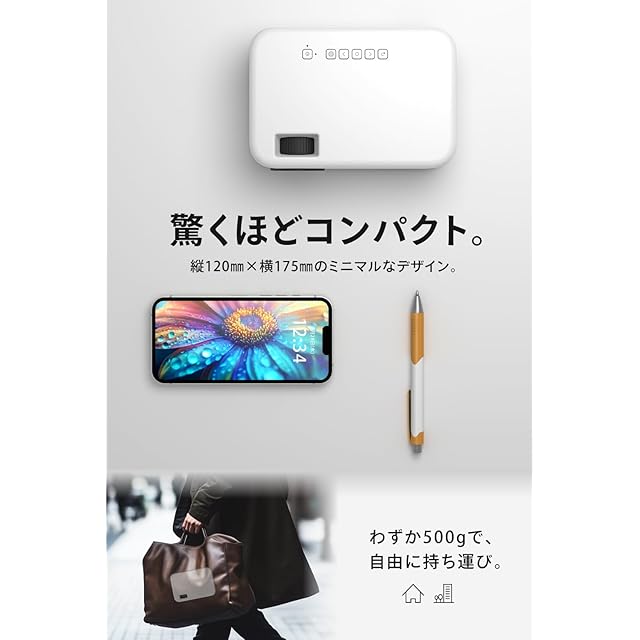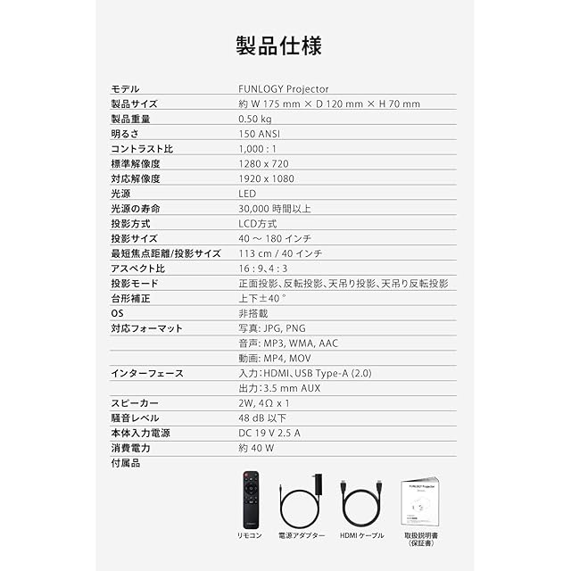 ✅【商品仕様】(本体)サイズ:W 175 mm× D 120 mm× H 70 mm / 重量:0.5 kg / (画質)明るさ:150ANSIルーメン / 標準解像度:1280 × 720 / 対応解像度:フルHD(1920 × 1080) / コントラスト比:1000:1 / 投影方式 : LCD / 投影サイズ : 40~180インチ / 最短焦点距離・投影サイズ : 113cm・40インチ / 光源: LED / 光源の寿命 : 30,000時間以上 / アスペクト比 : 16:9、4:3 / 投影モード : 正面投影、反転投影、天吊り投影、天吊り反転投影 / 台形補正 : 上下±40° / OS : 非搭載 / 対応フォーマット : JPG、PNG、BMP、MP3、WMA、AAC、MP4、MOV / インターフェイス : 入力:HDMI、USB Type-A (2.0)、出力:3.5 mm AUX / スピーカー : 2W,4Ω×1 / 騒音レベル : 48dB以下 / 電源 : DC 19V 2.5A / 消費電力 : 40W