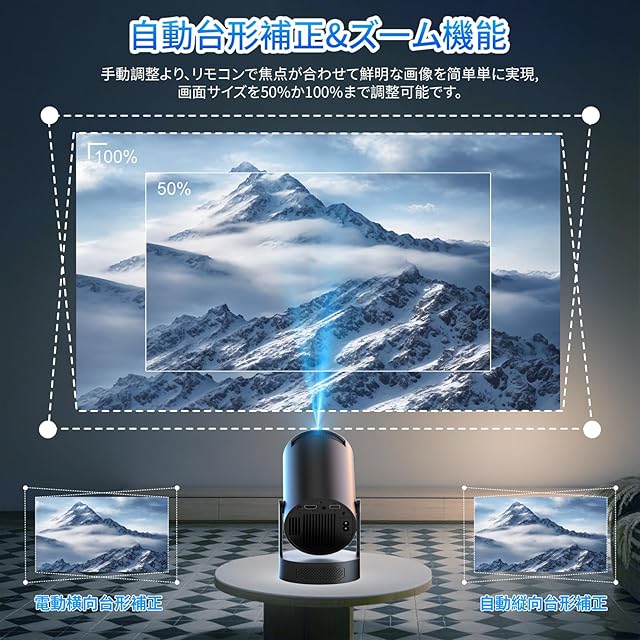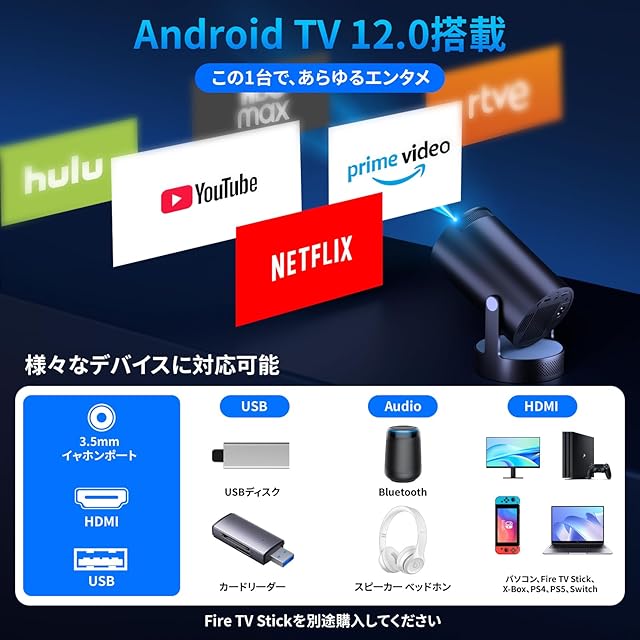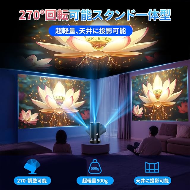 商品名:【2025新登場&スピーカー増幅型】プロジェクター 家庭用 Android TV12.0 搭載 【4K対応・1080P・18000LM】 小型 270°回転可能&天井投影 ホームシアター Wi-Fi6 Bluetooth5.4 HiFiスピーカー スタンド一体型 短距離投影 自動台形補正 パソコン/スマホ/Switch/PS機/DVD接続可 日本語の説明書付き