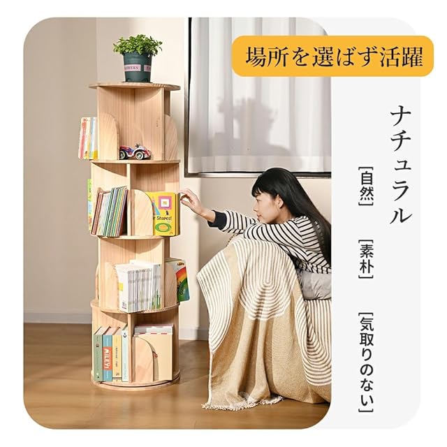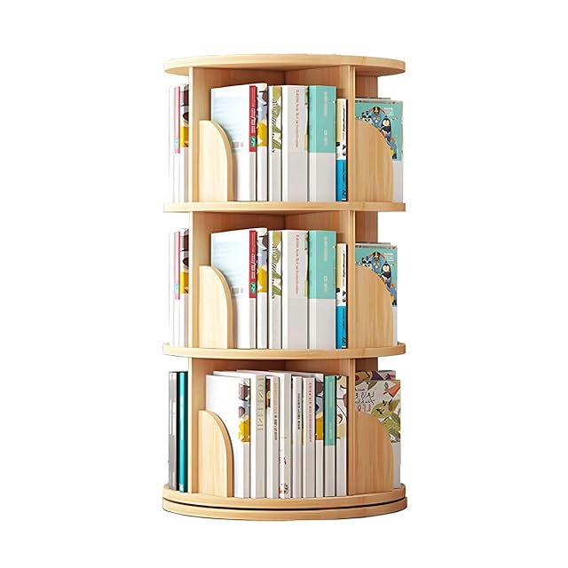 Yumcute 本棚 回転式本棚 【天然木】 3段 大容量 スリム コミックラック 絵本棚 漫画 収納 回転ラック ブックシェルフ 収納棚 CDラック DVDラック 天板に物が置ける