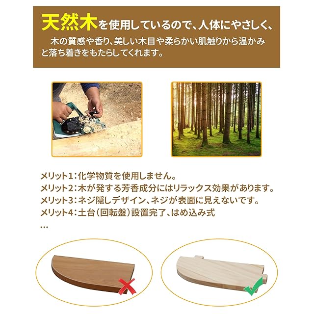 【100%の無垢材】天然の無垢材が使われており、木の風合いがやさしいです。滑らかな棚は耐磨、水や汚れに強い、防サビ、布で拭くだけで、きれいになっております,人間工学に基づいた円形設計で、ぶつかっても怪我を防げて柔らかい印象を与え、より安全で快適に使用できます。