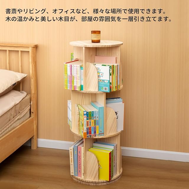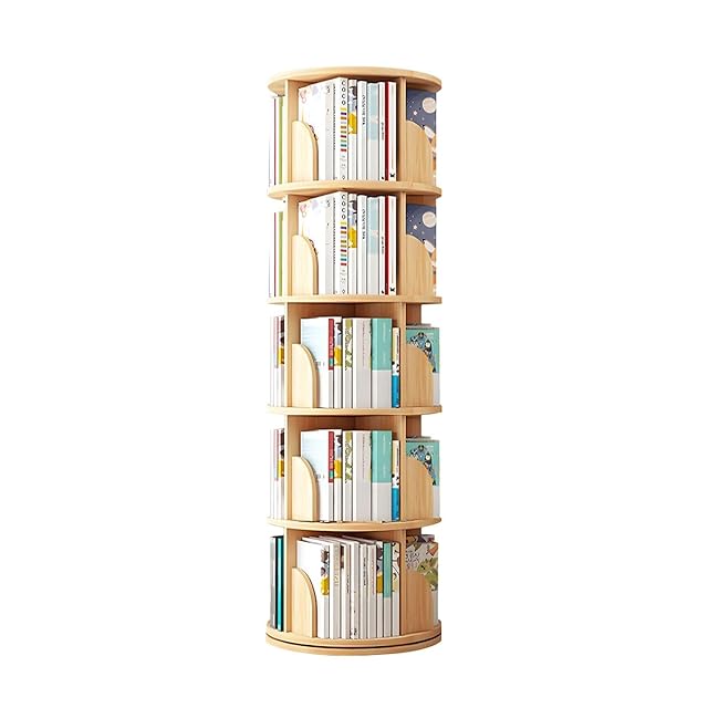 Yumcute 本棚 回転式本棚 【天然木】 5段 大容量 スリム コミックラック 絵本棚 漫画 収納 回転ラック ブックシェルフ 収納棚 CD DVD 天板に物が置ける