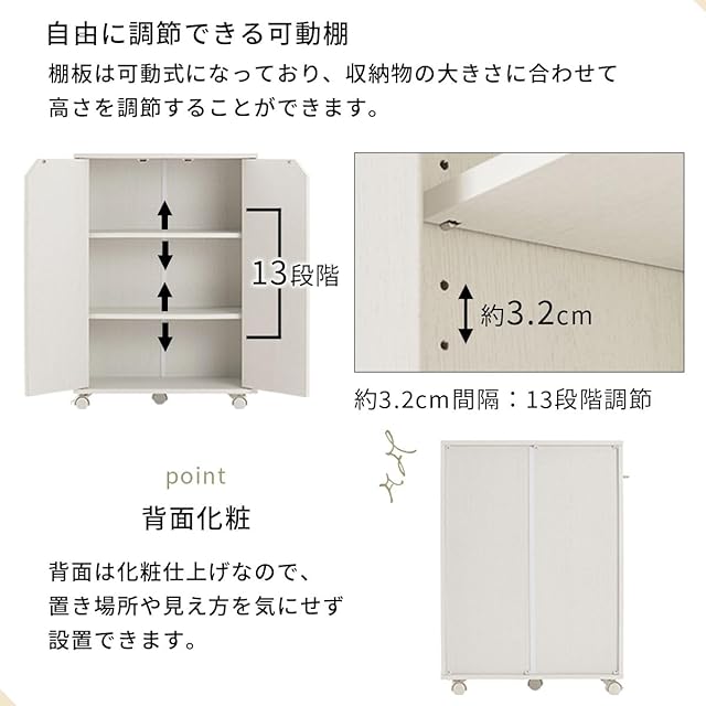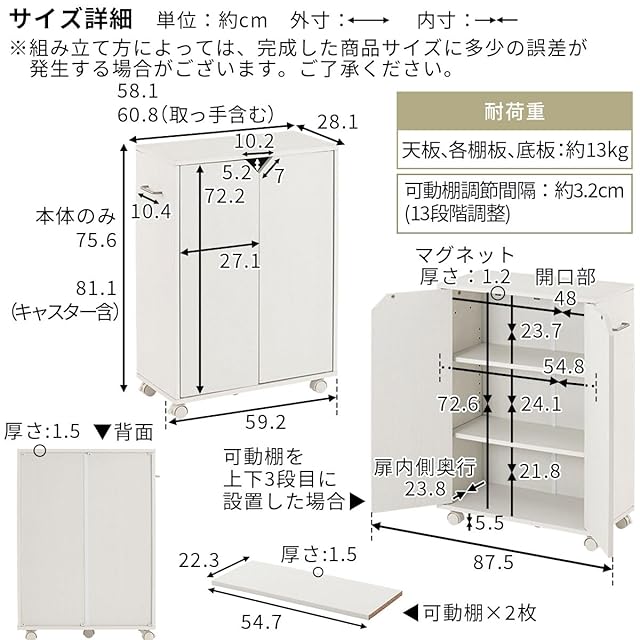 耐荷重 天板、各棚板、底板:約13kg / 選べる2WAY(キャスター・床置き) / 背面化粧:有り
