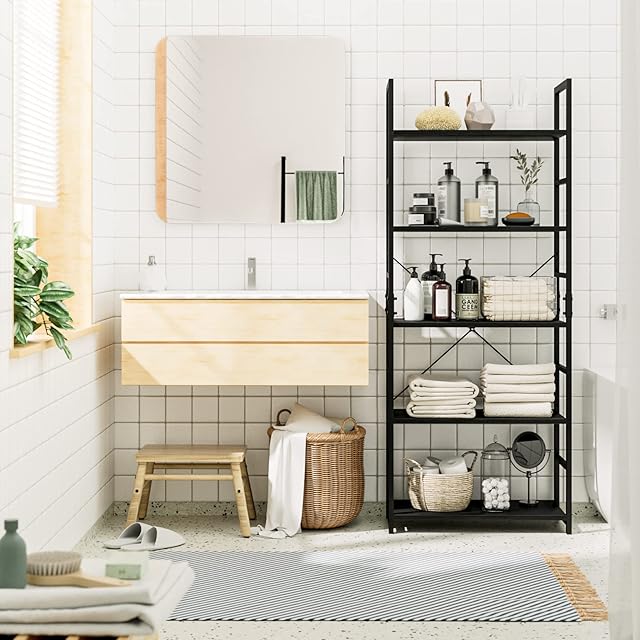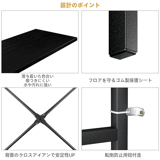 【高品質な金属製フレームと背面補強】高品質な金属とプラスターボードで作られたモダンな金属製のラックは安定性に優れています、頑丈で耐久性があります。最上級の防錆コーティングにより、ラック全体がよりおしゃれに見えます。高品質な金属製フレームと背面補強により、ラックの棚板一枚あたり23kgの耐荷重を持ち、背面の金属製クロスバーはラックをしっかり補強、重さのある生活用品を置いても大丈夫です。揺れたり、落下の心配はありません。