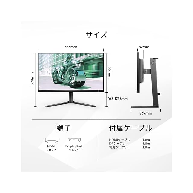 【付属品とケーブル】 DisplayPortケーブル(1.8m)、HDMIケーブル(1.8m)、電源ケーブル(1.8m)、クイックスタートガイド、書、ケーブル付属リスト、ベーススタンド、ベース支柱。【本体サイズ(スタンドあり)(mm)】 508 (H) × 557 (W) × 239 (D)、4.34kg。【安心サポート】 お買い上げより5年間無償修理(詳細は製品画像をチェック!)。
