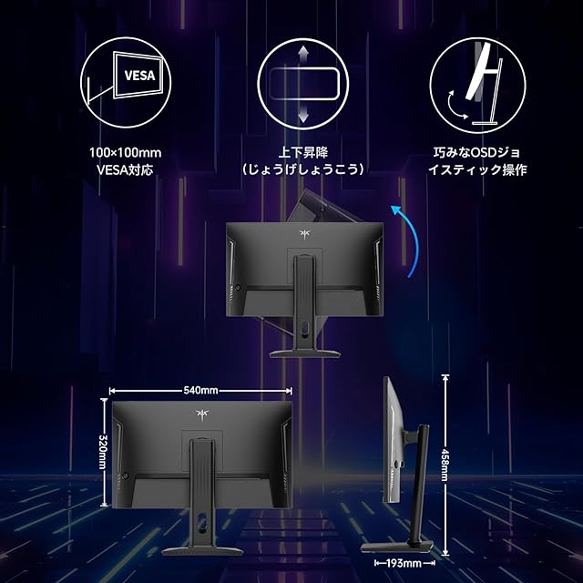 【フル調整スタンド & VESA対応 】傾斜角度 (Tilt)前傾:-5°±3°後傾:20°±3/中心軸回転 (Pivot)90°±5°/昇降高さ (Elevation)110±5mm。VESA 100mm×100mm壁掛け対応で、柔軟な接続と設置が可能。ゲーム機、在宅作業、動画視聴、ノートPC拡張に最適。