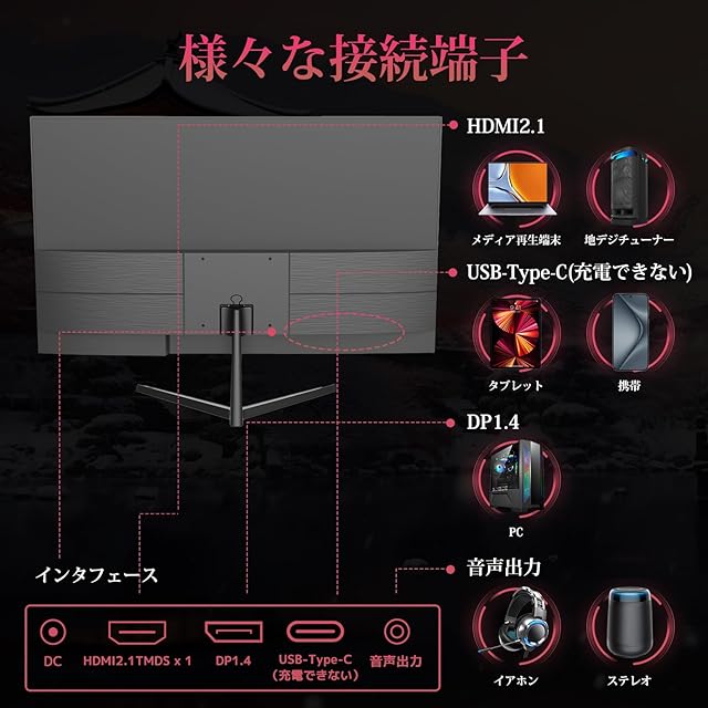 【マルチデバイス接続】豊富な入力端子:HDMI 2.0、DisplayPort 1.4、USB Type-C(映像伝送対応)を装備。PC・ゲーム機・ノートパソコンを柔軟に接続。[出力端子] 音声出力 内蔵スピーカー付き:オーディオ出力端子と2Wスピーカーでシンプルなオーディオ環境を構築 [付属品の充実] HDMIケーブル・スタンド・電源アダプターを標準同梱し、日本市場向け日本語説明書もある。モニターのType‑C端子では給電・充電ができません。
