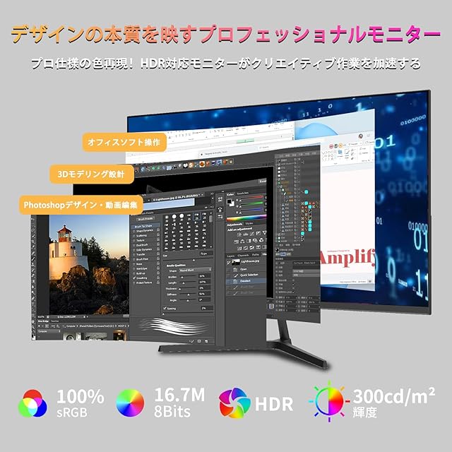 1、[画面サイズ] 27インチ VA モニター 、[最大解像度] FHD 1920×1080、[アスペクト比] 16:9、[コントラスト比] 3000:1、[輝度] 300cd/㎡ 、[色域]DCI-P3 95%、sRGB 130% [色深度] 16.7万色、8Bits、[曲率] 1500R、HDR対応。