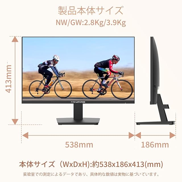 [画面サイズ] 24インチ モニター 、[最大解像度] 1920×1080、 [アスペクト比] 16:9、 [コントラスト比]1000:1、 [輝度] 250cd/㎡ 、[色域] 72% NTSC、sRGB110%[色深度]16.7万色、8Bits、HDR10対応。