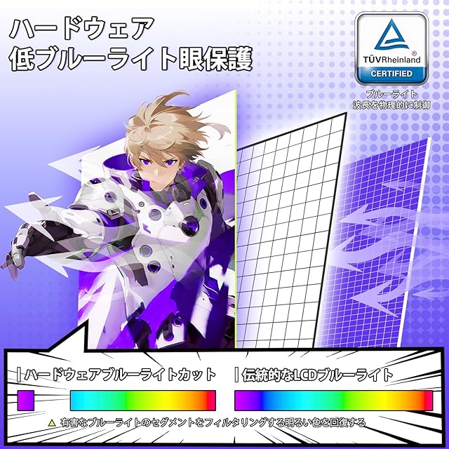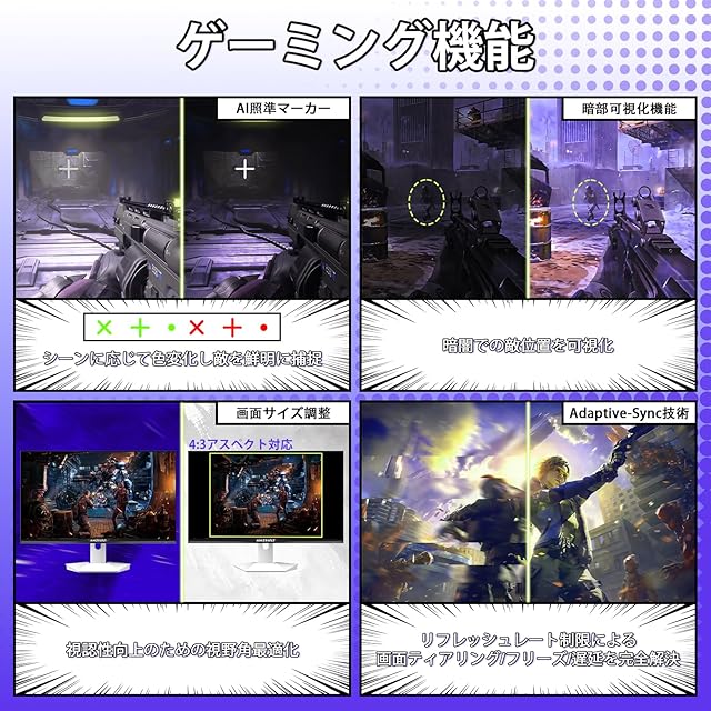 Adaptive Sync技術を搭載し、ティアリングやスタッタリングを効果的に抑制。HDR対応で、明るい部分と暗い部分のコントラストが鮮明になり、ゲームの臨場感がアップ。フリッカーやブルーライト低減機能も搭載し、長時間のゲームプレイでも目を保護します。視覚最適化技術:ノイズリダクション(映像鮮明化)・ダイナミック輝度制御・戦術支援(クロスヘア/RTS/FPS/レーシングモード)を搭載