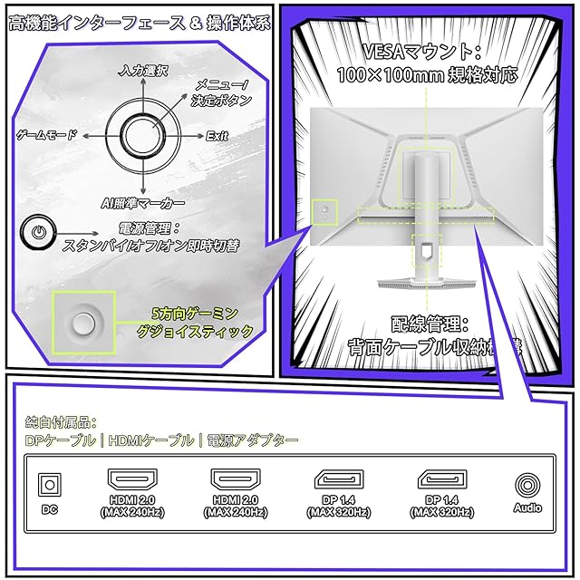 2つのHDMI 2.0ポートと2つのDP 1.4ポートを備え、様々なデバイスとの接続が可能。パソコン、ゲーム機、ノートパソコンなど、多用途に対応します。HDMIケーブル1本、DPケーブル1本;オーディオジャック(内蔵スピーカーなし);VESA 100mm * 100mm