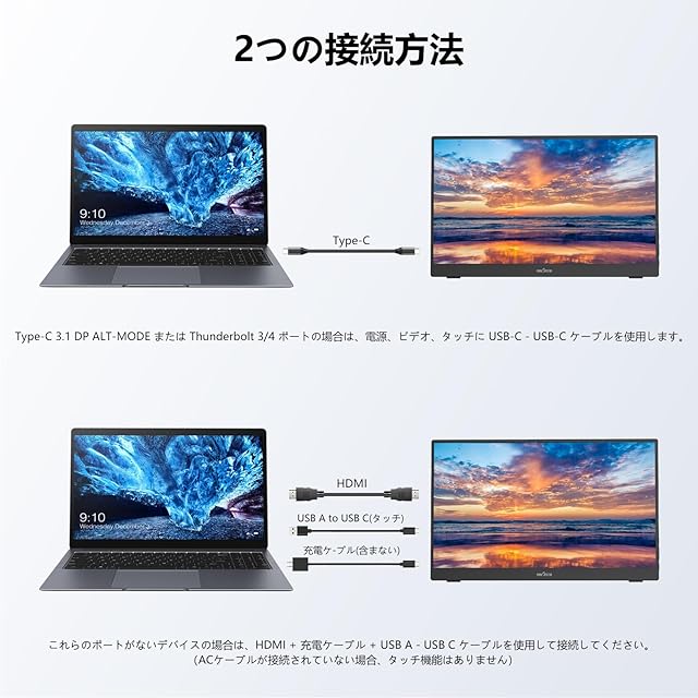 【USB Type-Cケーブル1本で接続&効率2倍】このポータブルモニターには2つの全機能USB Type-Cポートが搭載されており、スマホやPCをUSB Type-Cケーブル一本で簡単に接続するだけで画面が表示されます。特別なドライブや電源を必要とせず、標準的なHDMIポートもあわせて搭載されています。効率的に仕事を処理し、一度に複数のタスクを処理できます。例えば、メールを確認しながら文書編集や、インターネットでの資料検索と同時にメモを取ることができます。*注意:使用中のデバイスのUSB Type-CポートはDisplayPort Altモードをサポートしている必要があります。もしディスプレイの輝度や音量が低い場合は、15W以上の電源アダプターを使用して電力を供給してください。(アダプターは付属品に含まれません)