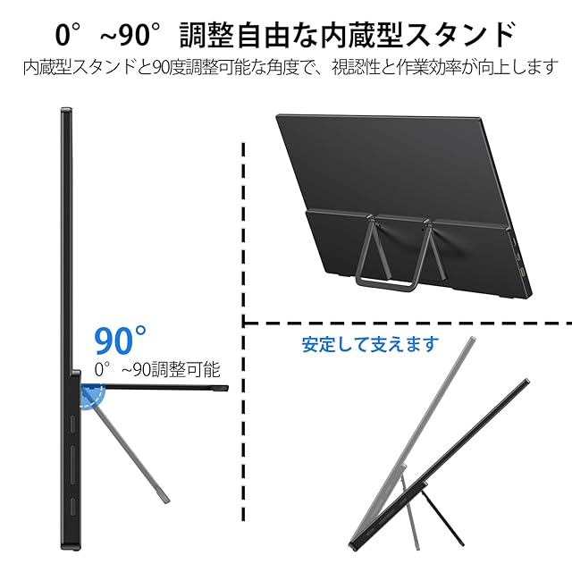 【自立スタンド付き・壁掛けに対応】自立スタンドで0°~90°の角度を自由に調整でき、十分な固定力で安心。大角度での倒れる心配もありません。縦置き時も一定の角度を保ち、倒れるリスクを最小限に。さらに、底部の滑り止めゴムが安定性を更に高めます。付属の保護バッグはモニターを保管し、使用後に保護することができ、持ち運びにも便利です。壁掛け穴の規格(75*75mm)に対応しているため、モニターアームを活用してより省スペースな設置も可能です。小さいスペースでも最善な配置が見つかります。