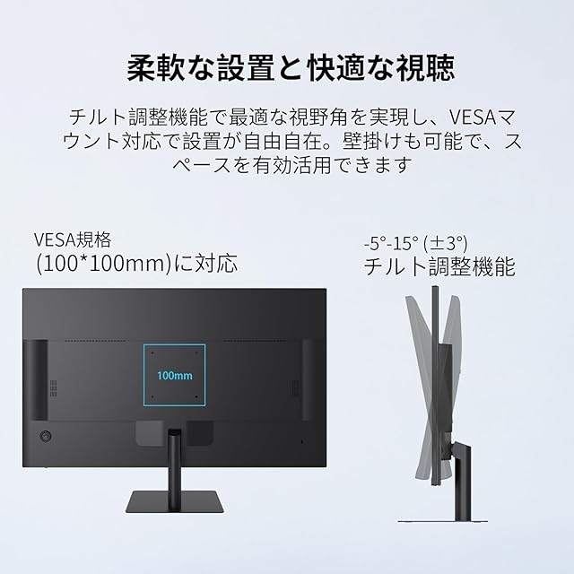 【多様な接続と人間工学設計】HDMI 1.4(1080P@100Hz対応)とVGA(1080P@75Hz対応)を装備し、PCやゲーム機など多様なデバイスに接続可能。VESAマウント対応で、チルト調整機能(-5°~15°±3°)により最適な視野角を簡単に設定できます。