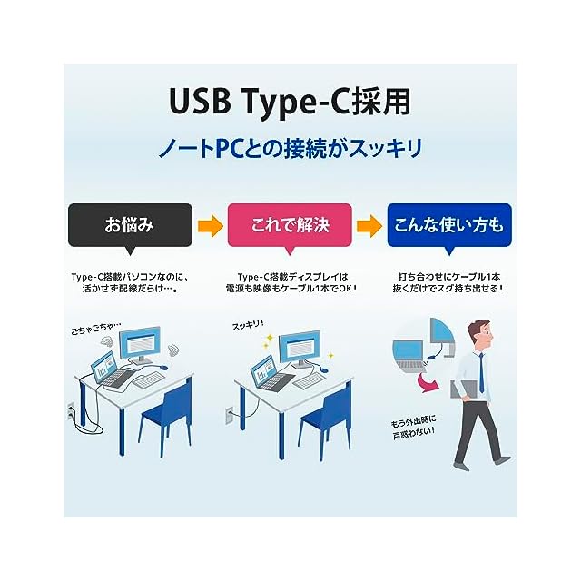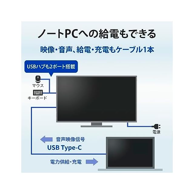 【USB Type-Cケーブル1本でスマートに接続!】USB Type-Cケーブルで接続することにより、映像・音声・ノートPCへの給電および充電がケーブル1本で行われます。さらに、USBハブを2ポート搭載。マウスやキーボードなど常時接続している機器を本商品につなげば、ノートPCとの接続がスッキリ。そのほか、HDMI、DisplayPortを搭載しているので、幅広い機器をつないでご利用いただけます。※USB Type-Cでの映像・音声入力は、ご使用される機器にDisplayPort Alt Mode対応のUSB Type-C ポートが必要です。※USB Type-Cでの電源供給および充電は、ご使用される機器にUSB Power Delivery対応のUSB Type-C ポートが必要です。※ノートPCへの給電は65Wまで、USBハブは各ポート900mAまで。※USB Type-C USB 3.2 Gen2ケーブルをお使いください。
