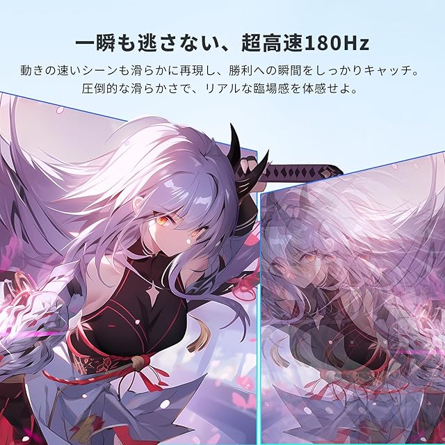 【2K WQHD & 180Hz 超高速リフレッシュレート】2560×1440の高解像度で、細部までくっきりとした映像を再現。さらに180Hzの超高速リフレッシュレートにより、高速な動きもブレることなく滑らかに表示。競技ゲームやアクションシーンでも圧倒的な優位性を発揮します。