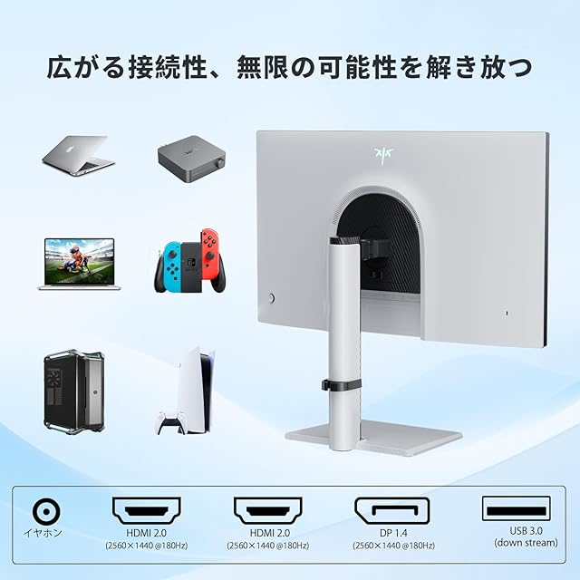 【5つの外部ポート & 多機能スタンド】チルト、スイベル、ピボット、エレーション機能を備えた多機能スタンドで、視野角や高さを自由に調整可能。さらにHDMI2.0やDP1.4など5つの外部ポートを搭載し、PCやゲーム機、その他デバイスとの接続も柔軟に対応します。
