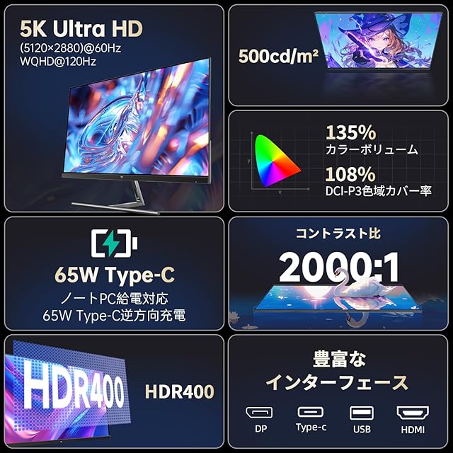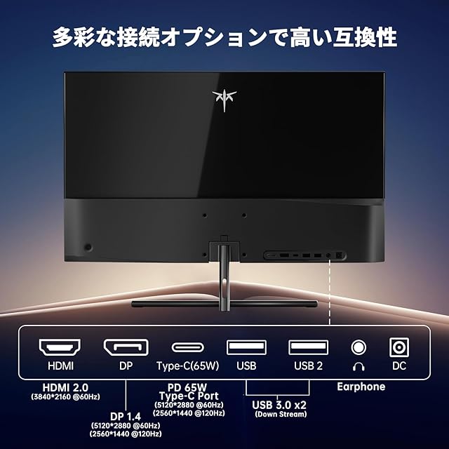 【多様な接続オプション】DP 1.4×1 (5120*2880@60Hz) /(2560*1440)@120Hz Type-C×1(5120*2880@60Hz)(PD65W) (2560*1440@120Hz) HDMI2.0×1 (3840*2160@60Hz)、USB3.0×2 多機器接続に対応しやすく設計されています。接続の柔軟性と利便性を両立。