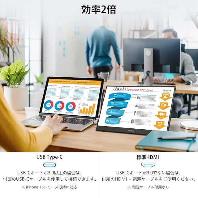 【USB Type-Cケーブル1本で接続&効率2倍】このポータブルモニターには2つの全機能USB Type-Cポートが搭載されており、スマホやPCをUSB Type-Cケーブル一本で簡単に接続するだけで画面が表示されます。特別なドライブや電源を必要とせず、標準的なHDMIポートもあわせて搭載されています。効率的に仕事を処理し、一度に複数のタスクを処理できます。例えば、メールを確認しながら文書編集や、インターネットでの資料検索と同時にメモを取ることができます。*注意:使用中のデバイスのUSB Type-CポートはDisplayPort Altモードをサポートしている必要があります。もしディスプレイの輝度や音量が低い場合は、15W以上の電源アダプターを使用して電力を供給してください。(アダプターとHDMIケーブルは付属品に含まれません)