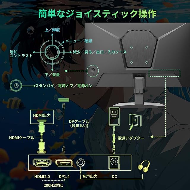 24インチ Fast IPS ゲーミングモニター:200Hz・1msの疾走感と鮮やかな色彩でゲームに勝利する 当モニターは、24インチFast IPSパネルと200Hzの超高リフレッシュレート、1ms(MPRT)の高速応答を実現。AMD FreeSync対応で、あらゆるゲームの激しい動きもぶれやティアリングなく、驚くほど滑らかに表示します。DCI-P3 80% / sRGB 110%の広色域カバー率が、豊かで臨場感あふれるビジュアルを約束。ブルーライト軽減&フリッカーフリー技術で、長時間のプレイも目に優しく、eスポーツからキャジュアルプレイまで完全に対応。 接続性も充実:HDMI 2.0とDisplayPort 1.4を装備し、高品質な映像と音声を出力。付属のHDMIケーブルとアダプターですぐにセットアップ可能です(DPケーブルは別売)。さらに内蔵スピーカーを搭載しており、ヘッドホンや外部スピーカーがなくても手軽にゲーム世界に没入できます。コンパクトで現代的なデザインとVESAマウント対応で、あらゆるゲーミング setup にフィットする、バランスに優れた一台です。