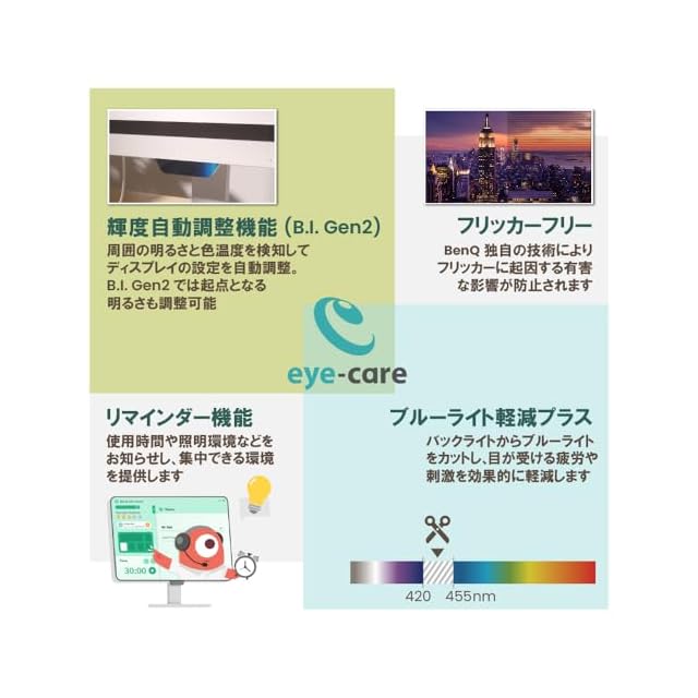 輝度自動調整機能(B.I. Gen2)を搭載し、環境の明るさを検知し、画面やコンテンツの輝度を自動調整。Gen2では、調整の起点となる明るさを調整し、お好みに合わせた明るさ設定が可能です。