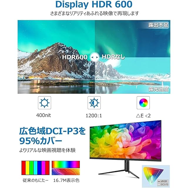 HDR 600&95%DCI-P3広色域: HDR600にも対応可能で、パネル16分割、露出不足や露出過度などの問題を解決し、様々なリアリティあふれる映像を再現できます。また、デジタルシネマ規格で、DCI-P3のカバー率は95%まで達し、映像撮影に使われるカラーフィルムの色域にも対応でき、より鮮明な画像や映像を表示可能となり、sRGBディスプレイでは再現し切れない豊かな色合いを体験できます。プロの方々が仕事現場で撮影・収録された映像素材を表示・確認することも可能です。