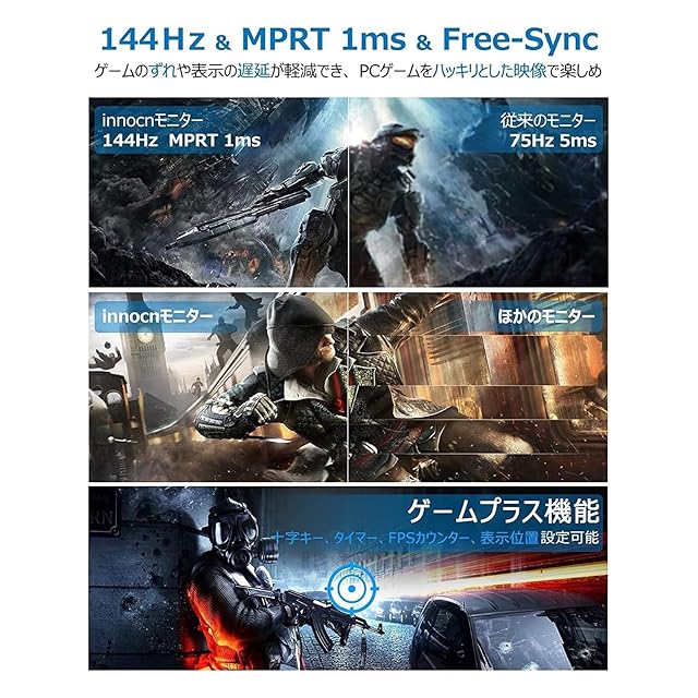 AMD FreeSync Premium&144Hz&MPRT 1ms: AMD FreeSync Premiumを搭載し、画面のティアリングやフレームレートの不安定性を取り除き、表示の遅延を最低限に抑えられます。また、144Hzのリフレッシュレートに対応可能で、高画質を維持しながら残像感のない滑らかな画面を表示できます。1msの応答スピードで、モニターの画面が素早く移り変わられ、ゲーミングに重宝のパートナーです。