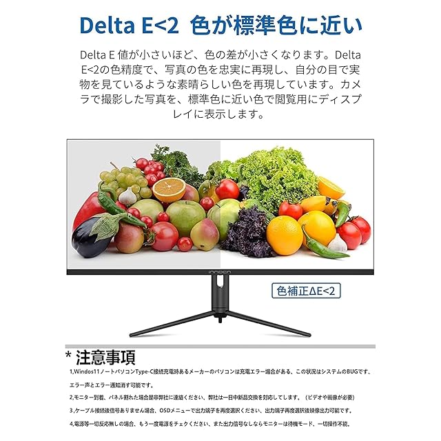 Delta<2色補正&TUV認証&ブルーライト軽減: InnocnモニターはDeltaE<2の色精度を持ち、標準色に近い画面を忠実的に再現できます。また、ブルーライト軽減モードを搭載し、目に負担をかけ少ない紙に近い色温度で表示され、目に優しく、長時間ゲーミングや作業しても疲れにくいです。InnocnモニターはTÜVRheinland認証を取得済みで、より安心してご利用いただけます。1,Windos11ノートパソコンType-C接続充電時あるメーカーのパソコンは充電エラー場合がある、この状況はシステムのBUGです、 エラー声とエラー通知消す可能です。2,モニター到着、パネル割れた場合是非弊社に連絡ください、弊社は一日中新品交換を対応してします。(ビデオや画像が必要)3,ケーブル接続後信号ありません場合、OSDメニューで出力端子を再度選択ください、出力端子再度選択後映像出力可能です。4電源等一切反応無しの場合、もう一度電源をチェクください、また出力信号なしならモニターは待機モード、一切操作不能。