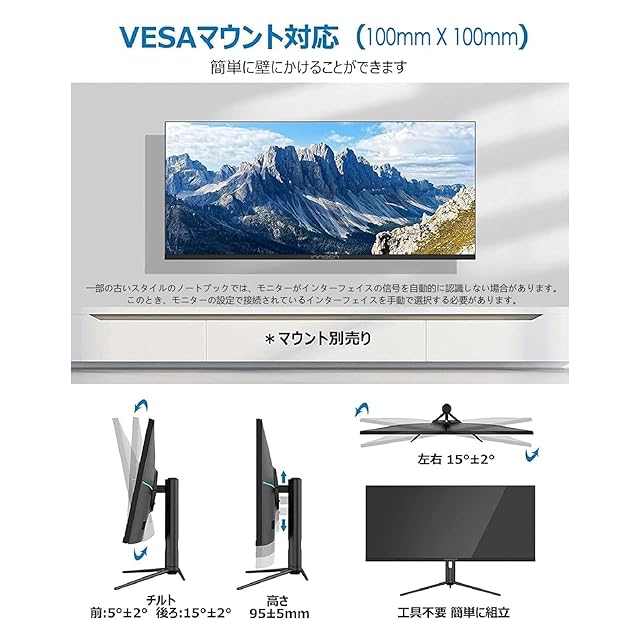 卓上置きと壁掛け2way取り付け&多種類入出力端子: 卓上置きだけでなく、VESAマウント(100*100mm、別売り)で壁に簡単に掛けられます。また、Audio Out入力端子、DP入力端子(Ver1.4)、HDMI入力端子(Ver2.0)*2、Type-C入力端子(Ver3.1)五つの入力端子が付いており、ゲーム機やAV機器など様々なデバイスに接続できます。更に、TYPE-C 90W端子を搭載し、PCと接続している際モニターからPCに給電できます。ビデオでモニターの設置方法を見ることができます。ご利用の際、弊社の付属品をご利用してください。