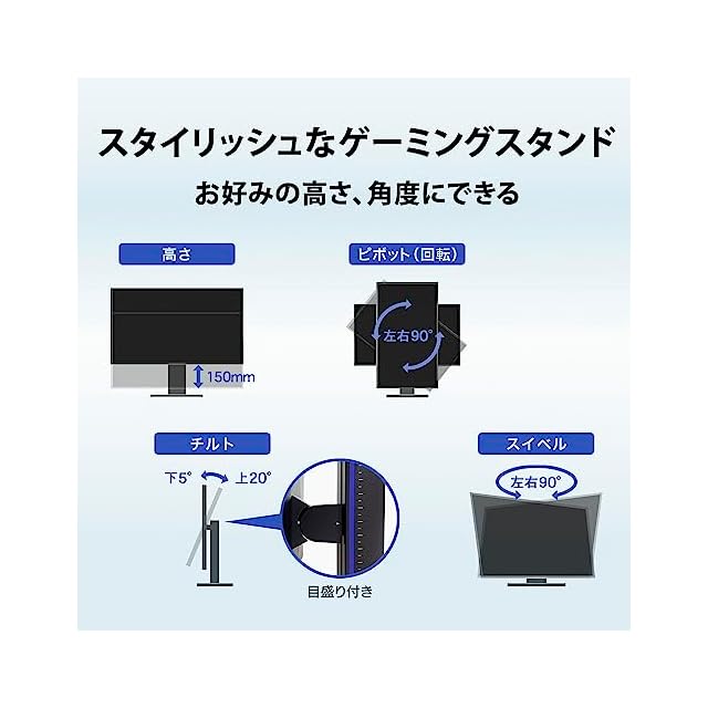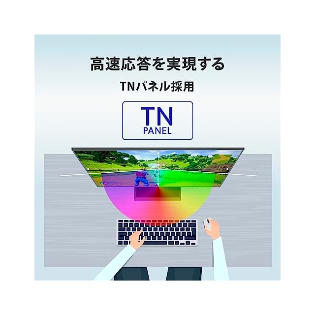 【高速応答を実現するTNパネルを採用】一般的なIPS、ADS方式のパネルと比べ、TNパネルは応答速度が速く、より残像感の少ない明瞭な映像表示が可能です。FPSゲームに最適なパネルとなり、ゲームプレイ時に、振り向きによる視点変化やインファイト中の激しい動きでも有利になる設計となっています。TNパネルは一般的なパネルと比べ、視野角や狭く色ズレが大きい特性がありますが、GigaCrystaで採用しているスタンドは角度、高さ調整が柔軟に行えるため、プレイヤーの環境・姿勢に合わせた角度調整を行うことで視野角による色ずれを防ぎ、よりパフォーマンスを発揮できる設計となっています。