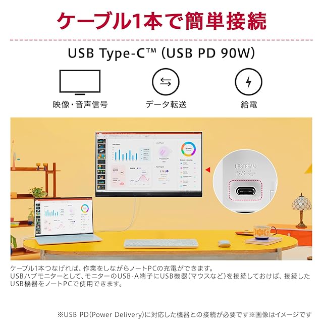 【ケーブル一本で簡単接続】 USB Type-C (USB PD 90Wまで) ケーブル1本で映像・音声信号、データ転送、給電*(90Wまで)が可能なUSB Type-C端子を搭載。お手持ちのノートパソコンも簡単にセットアップ。USB Type-C接続なら、作業をしながら、ノートパソコンの充電もできます。また、USBハブとして、モニターのUSB-A端子にUSB機器(マウスなど)を接続しておけば、接続したUSB機器をノートパソコンで使用できます。より少ないケーブルでデスク環境を構築できるので、デスク周りもスッキリきれい、デスク環境がより理想に近づきます。*USB Power Deliveryに対応した機器との接続が必要です※映像表示の場合は、DisplayPort Alternate mode対応のケーブルが必要となります