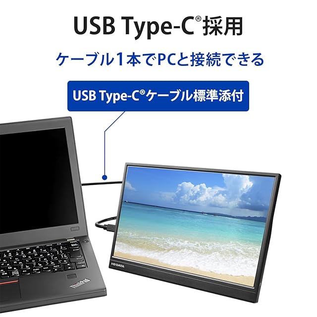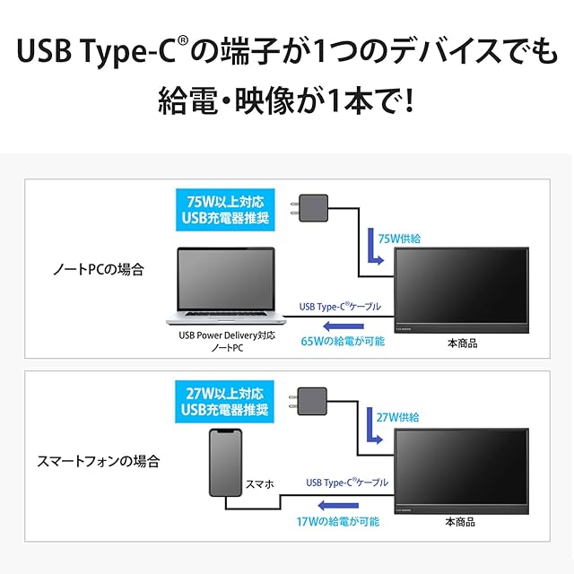 【USB Type-C採用!ケーブル1本でPCと接続できる!】USB Type-Cディスプレイ給電に対応。添付しているUSB Type-Cケーブルで接続することにより、パソコンからの映像出力と給電がケーブル1本で行われます。 従来品よりも柔らかいUSB Type-Cケーブルを採用、配線の取り回しがしやすく、収納時はコンパクトにまとめやすいです。
