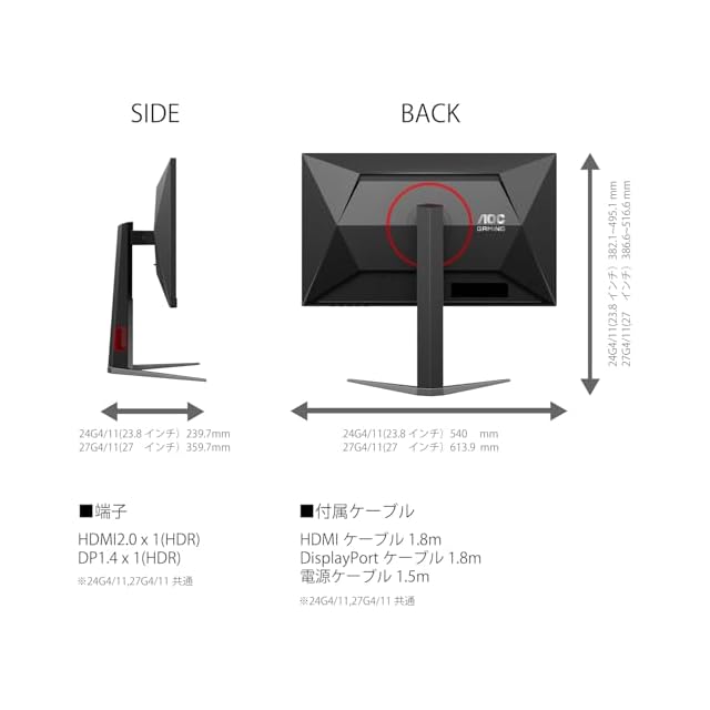[ 基本スペック ] 23.8インチ 1920x1080 FHD、高精細IPSパネル、ノングレア(反射防止)、視野角水平178°/垂直178°、輝度300cd/㎡、リフレッシュレート180Hz、応答速度1ms(GtG) 0.5ms(MPRT) 、コントラスト比80,000,000:1(DCR)、NTSC 113%(CIE1976)、sRGB 126%(CIE1931)、DCI-P3 103%(CIE1976) [ 入力端子/スピーカー ] DisplayPort1.4 x 1、HDMI2.0 x 1/スピーカーなし [ チルト/高さ調整/スイーベル/ピボット ] -5~23度/130mm/左右30度/左右90度 [ 付属ケーブル ] DisplayPortケーブル(1.8m)、HDMIケーブル(1.8m)、電源ケーブル(1.5m) [ 本体サイズ ] 540.0 (W) x 382.1~495.1 (H) x 239.7 (D) mm (VESA100x100mm)、4.0kg [ ] お買い上げより3年間(パネルに関しては1年間)センドバックサポート
