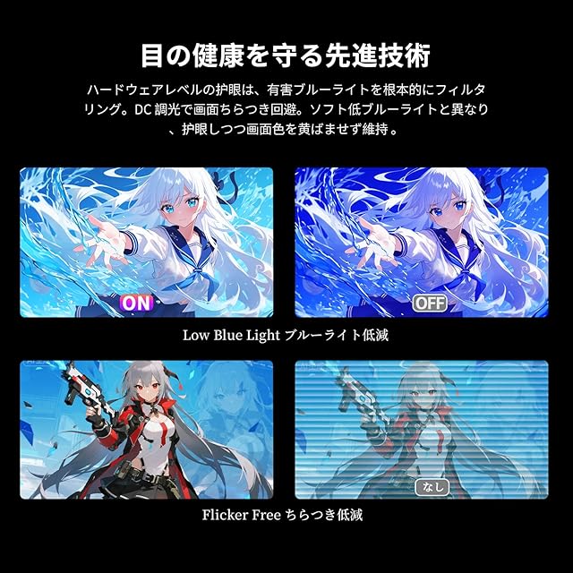 【高度なアイケア技術&長時間使用でも快適】TÜV Rheinland認証取得の低ブルーライト技術とDC調光方式(フリッカーフリー)を採用し、長時間のゲームプレイや作業でも目の疲れを軽減します。450cd/m²の高輝度を実現しており、明るいオフィスや窓際など、様々な環境でクリアな視認性を確保。5段階のブルーライト軽減モードを搭載し、使用シーンに応じて最適な設定が可能です。