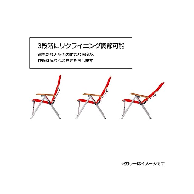 【三段階のリクライニング】ハイバックの背面が3段階にリクライニング可能のアウトドアチェア。シチュエーションに応じて好みのポジションでくつろげます。キャンプやバーベキュー、ピクニックで活躍します。